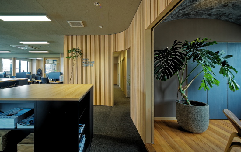 名古屋市のオフィスに、ラーチグリッドとチークAB積層フローリング